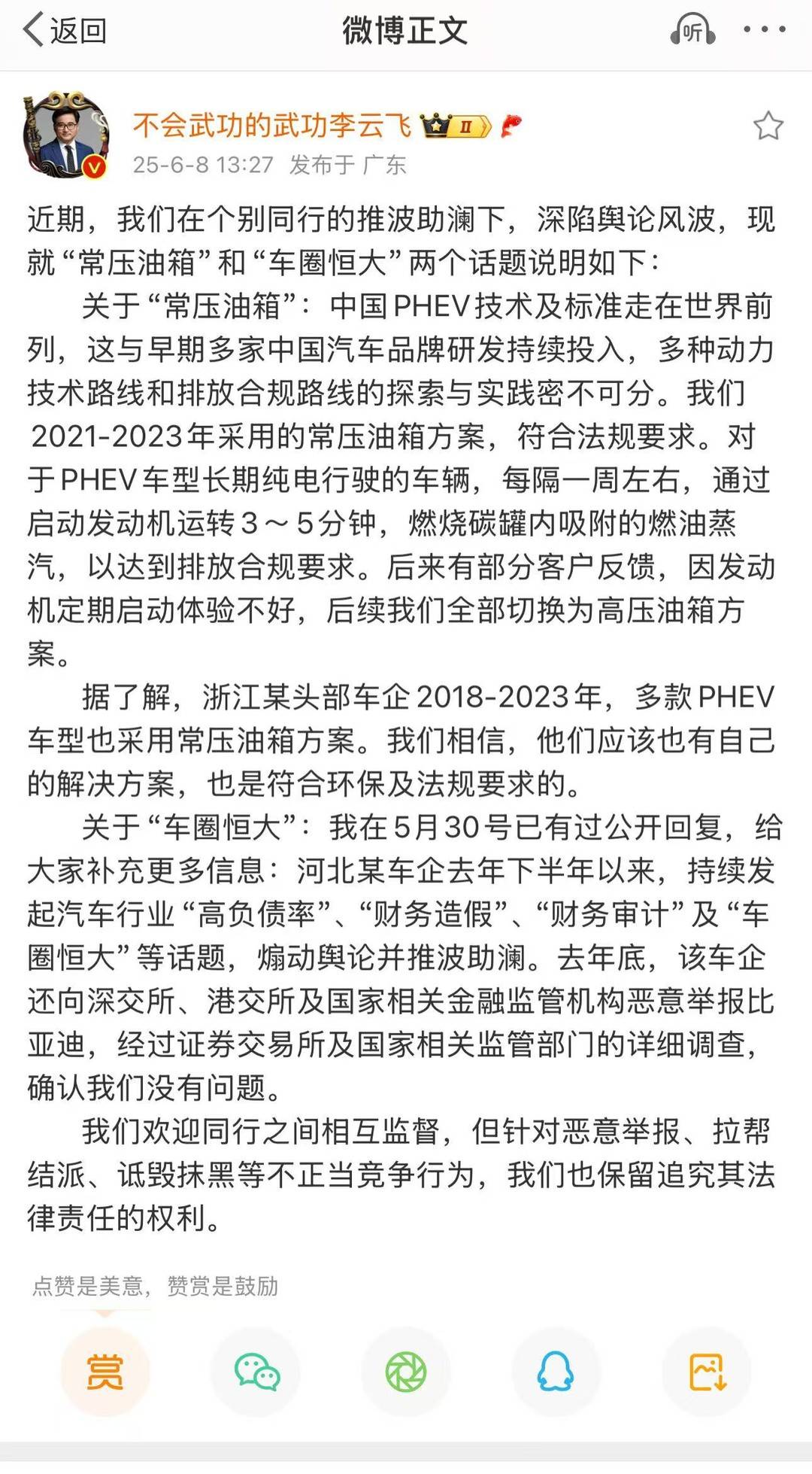刚刚,封面新闻从比亚迪集团品牌及公关处总经理李云飞微博获得最新消息:“近期,我们在个别同行的推波助澜下,深陷舆论风波,现就‘常压油箱’和‘车圈恒大’两个话题说明如下: